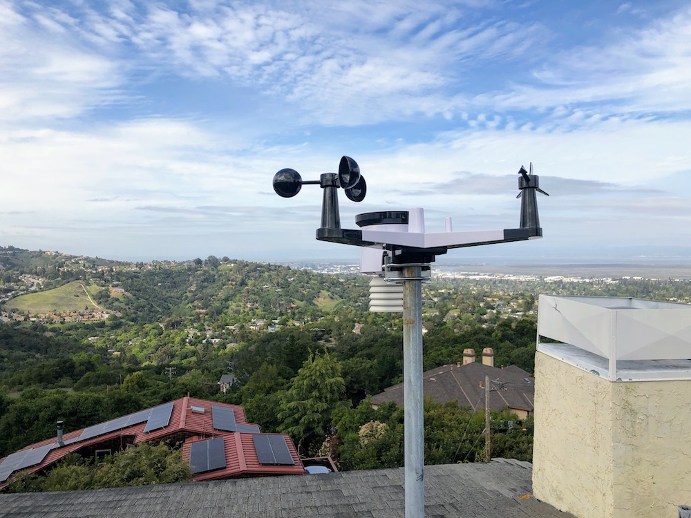 The Emerald Hills weather station is located in Emerald Hills, CA 94062, a residential area of unincorporated San Mateo county between Redwood City, Woodside and San Carlos California near Edgewood Park. The station is a privately owned. It has been in operation as a Davis Weather Monitor II since August 2008 and updated to a Ambeient WS2000 in April 2020. It is located at about 800 ft elevation on a rooftop with clear view in all directions. Click on the images below to find historical data from this weather station (note that Weather Underground includes historical data from the previous station going back to 2008).